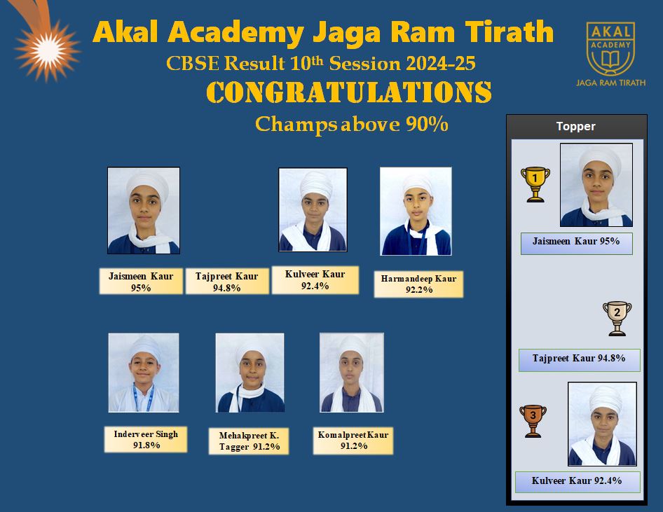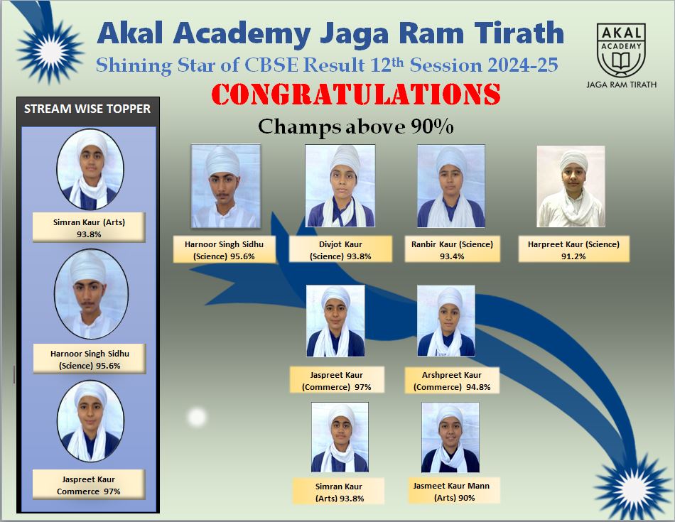 AA Jaga Ram Tirath • Bathinda CBSE Result 9 months agoAdd Commentby Akal Events Written by Akal Events “Congratulations to the students of Class 10th & 12th for their remarkable success. Your determination is inspiring!”